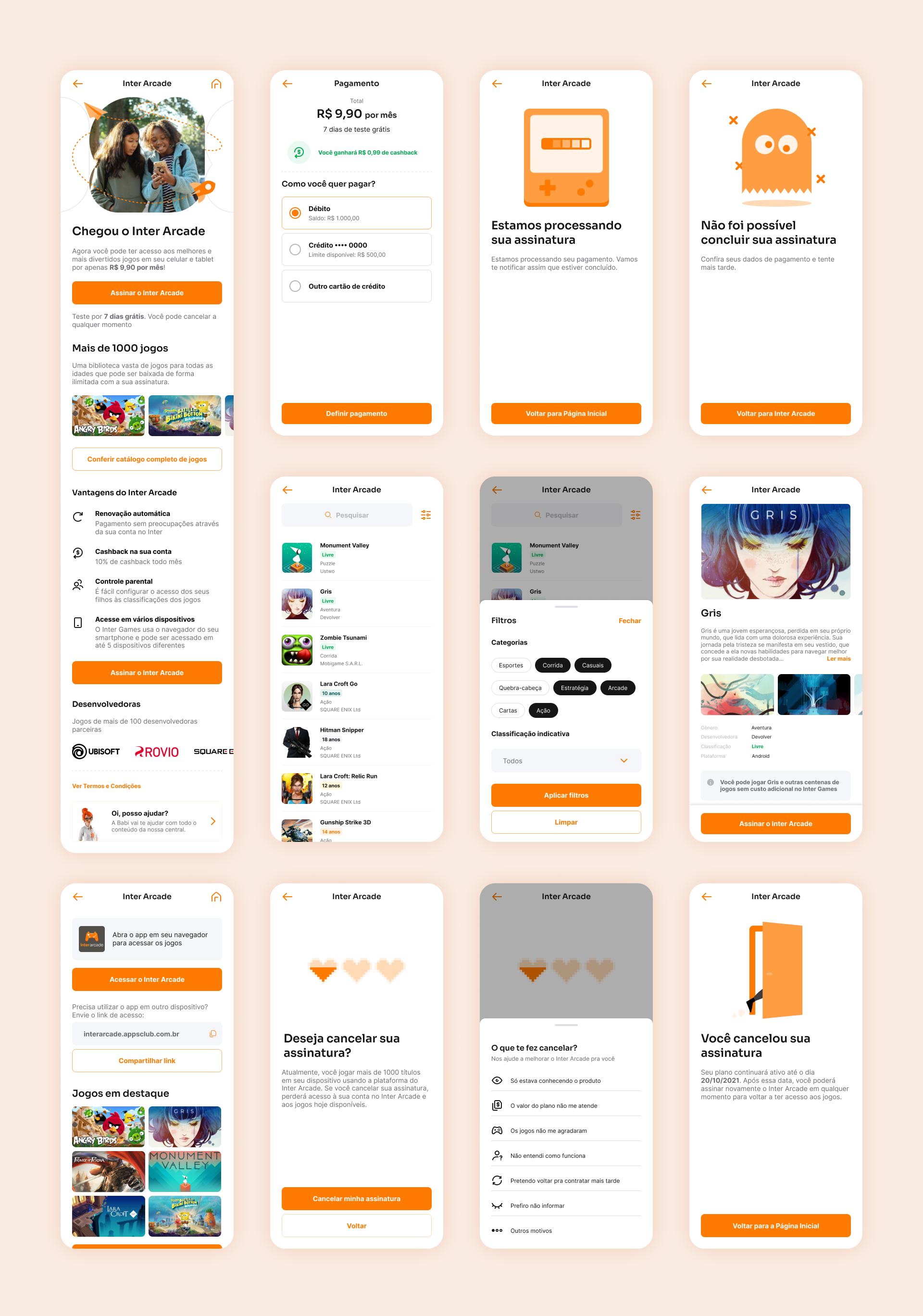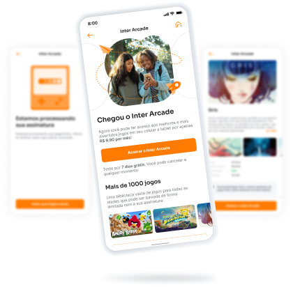 El primer proyecto se llamó Inter Arcade y consistía en una suscripción a una plataforma que ofrecía cientos de juegos mobile. Estos juegos se encontraban en un webapp de una empresa socia, y nosotros realizaríamos la contratación y gestión del servicio dentro de la aplicación de Inter. Este fue un proyecto piloto importante para estandarizar los flujos de contratación y cancelación de todos los futuros servicios de suscripción que ofreceríamos.
